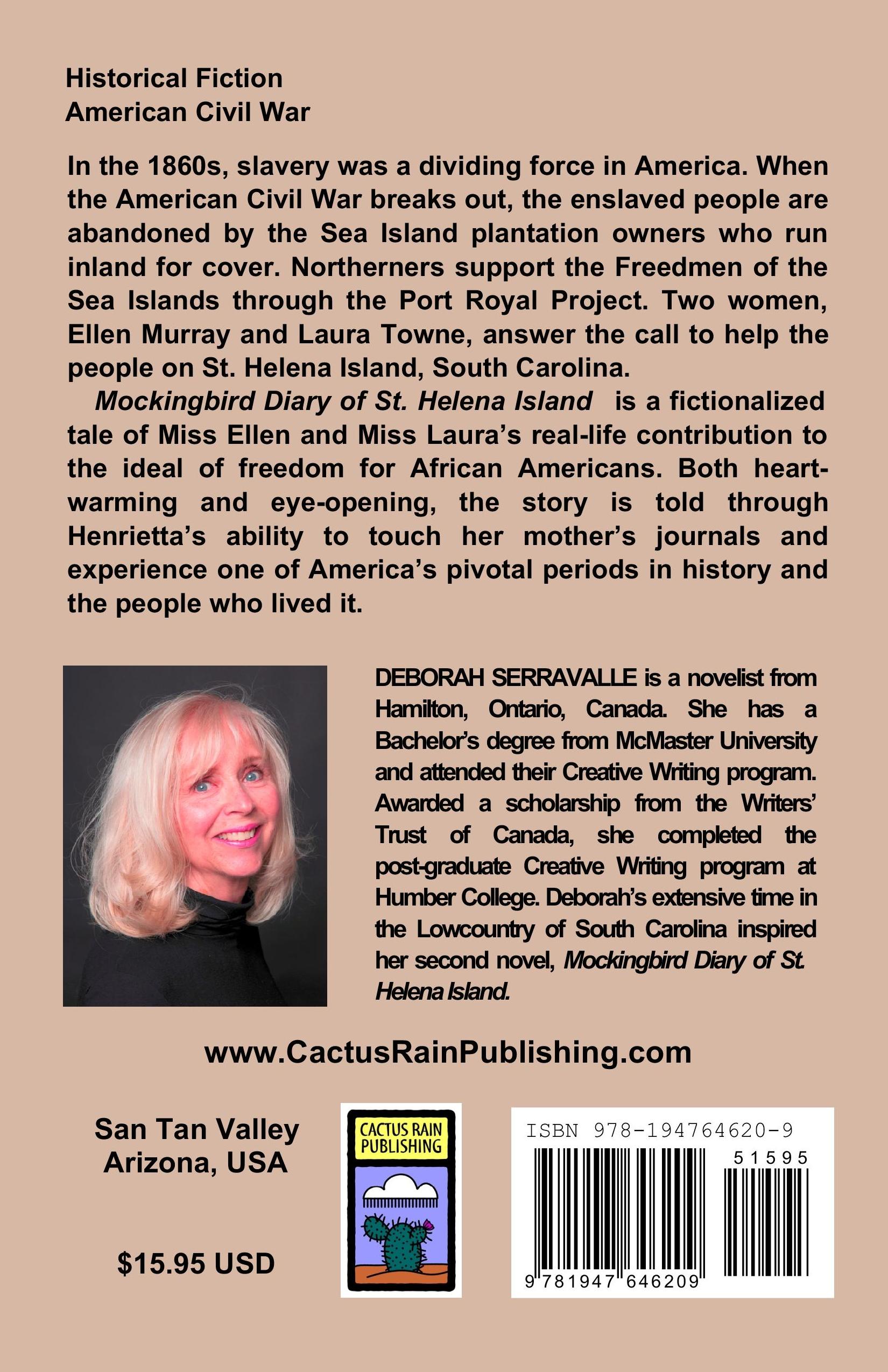 Deborah Serravalle is a novelist from Hamilton, Ontario, Canada. She has a Bachelor’s degree from McMaster University and attended their Creative Writing program. Awarded a scholarship from the Writers’ Trust of Canada, she completed the post-graduate Creative Writing program at Humber College. Deborah’s extensive time in the Lowcountry of South Carolina inspired her second novel, Mockingbird Diary of St. Helena Island.